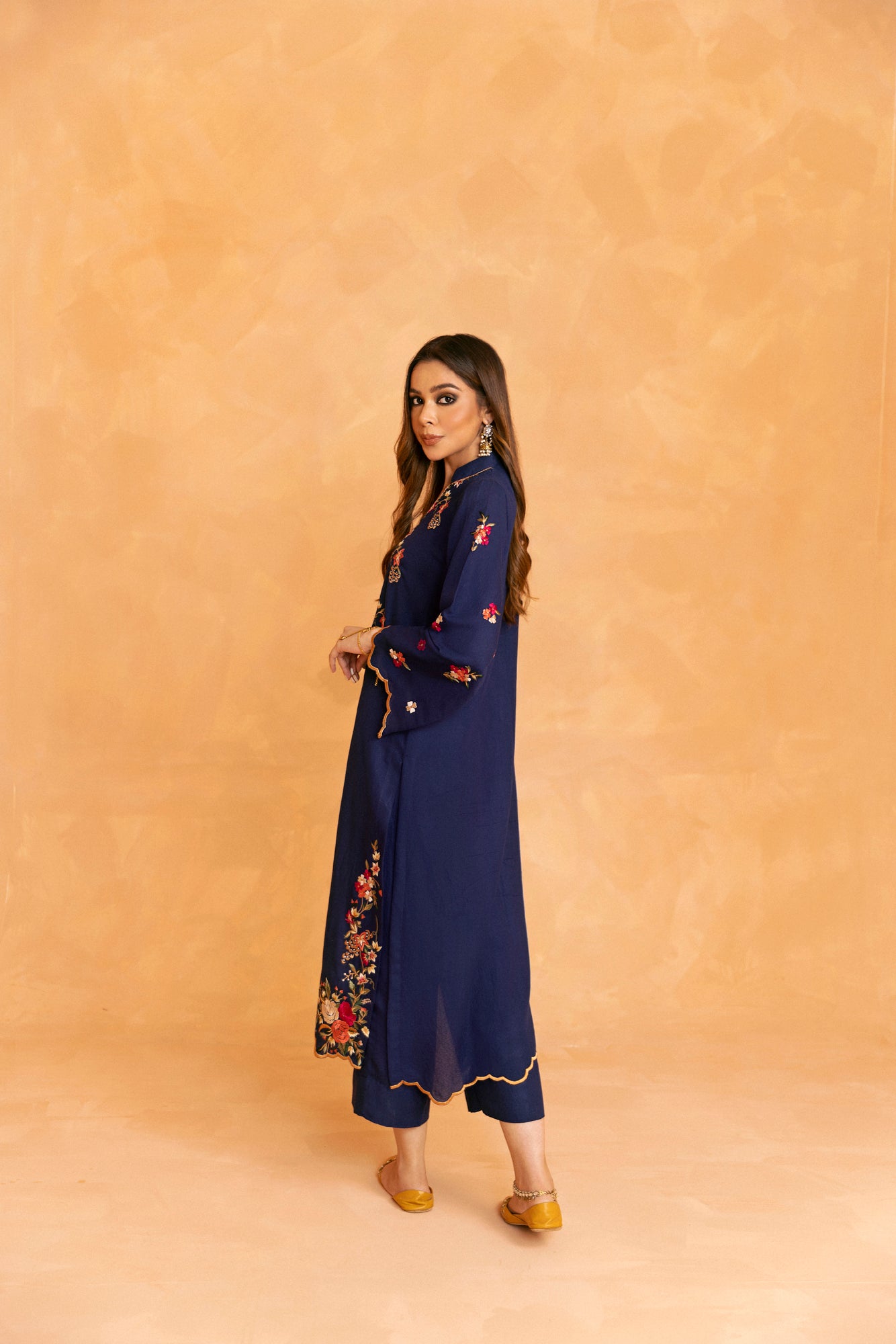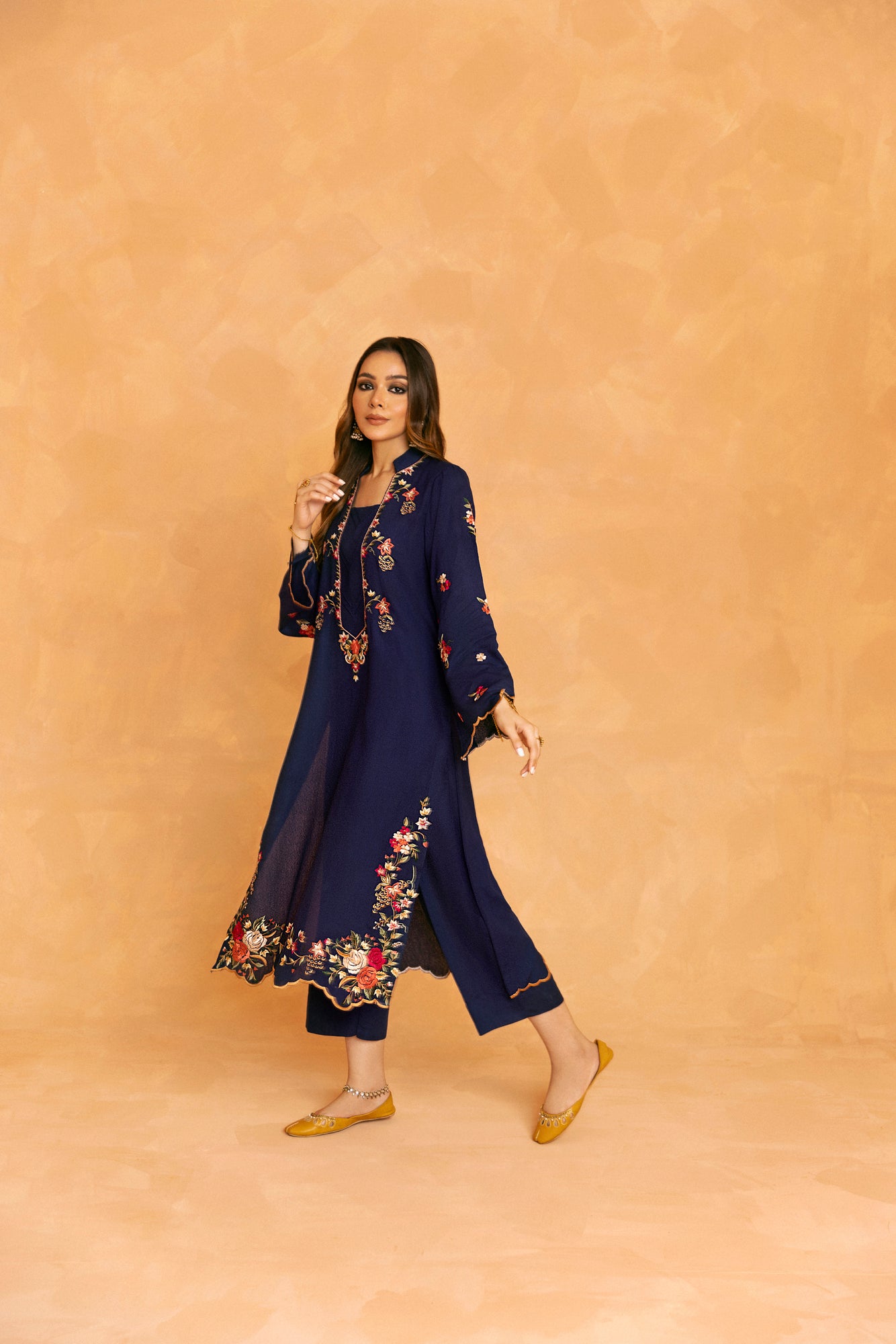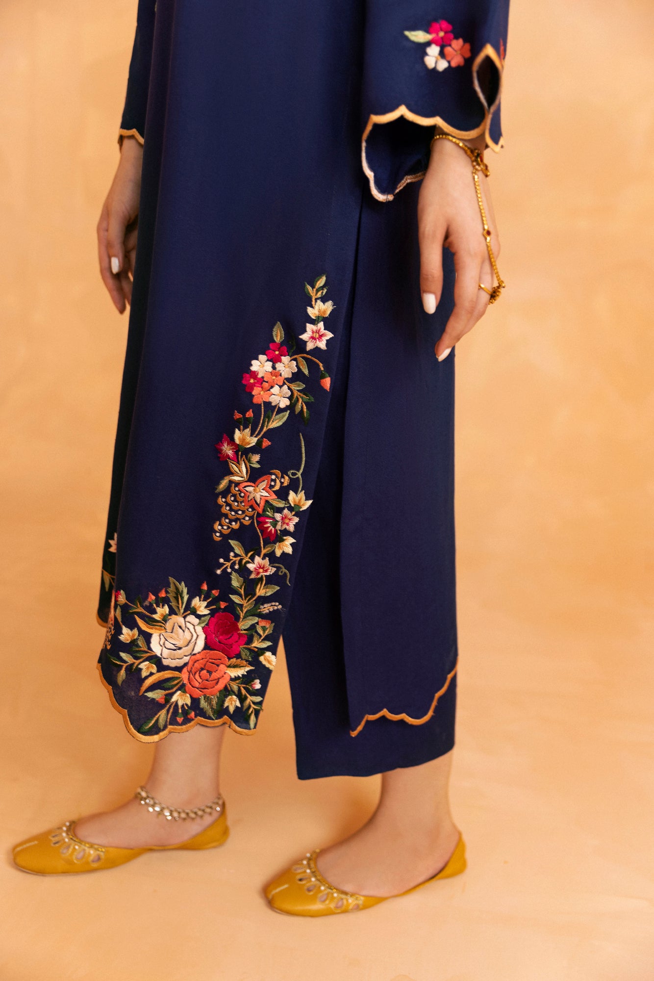 On a pure karandi base this two piece set has an embroidered shirt with floral motifs and scallops on hem and sleeves paired with slacks