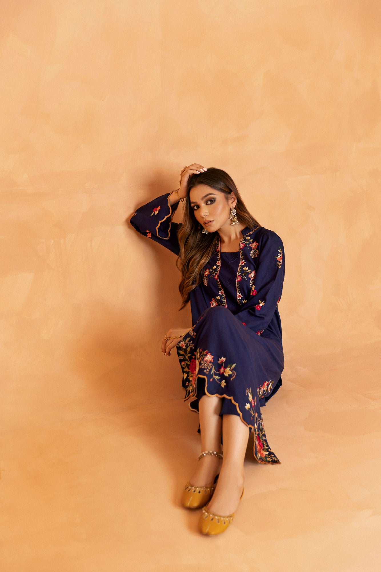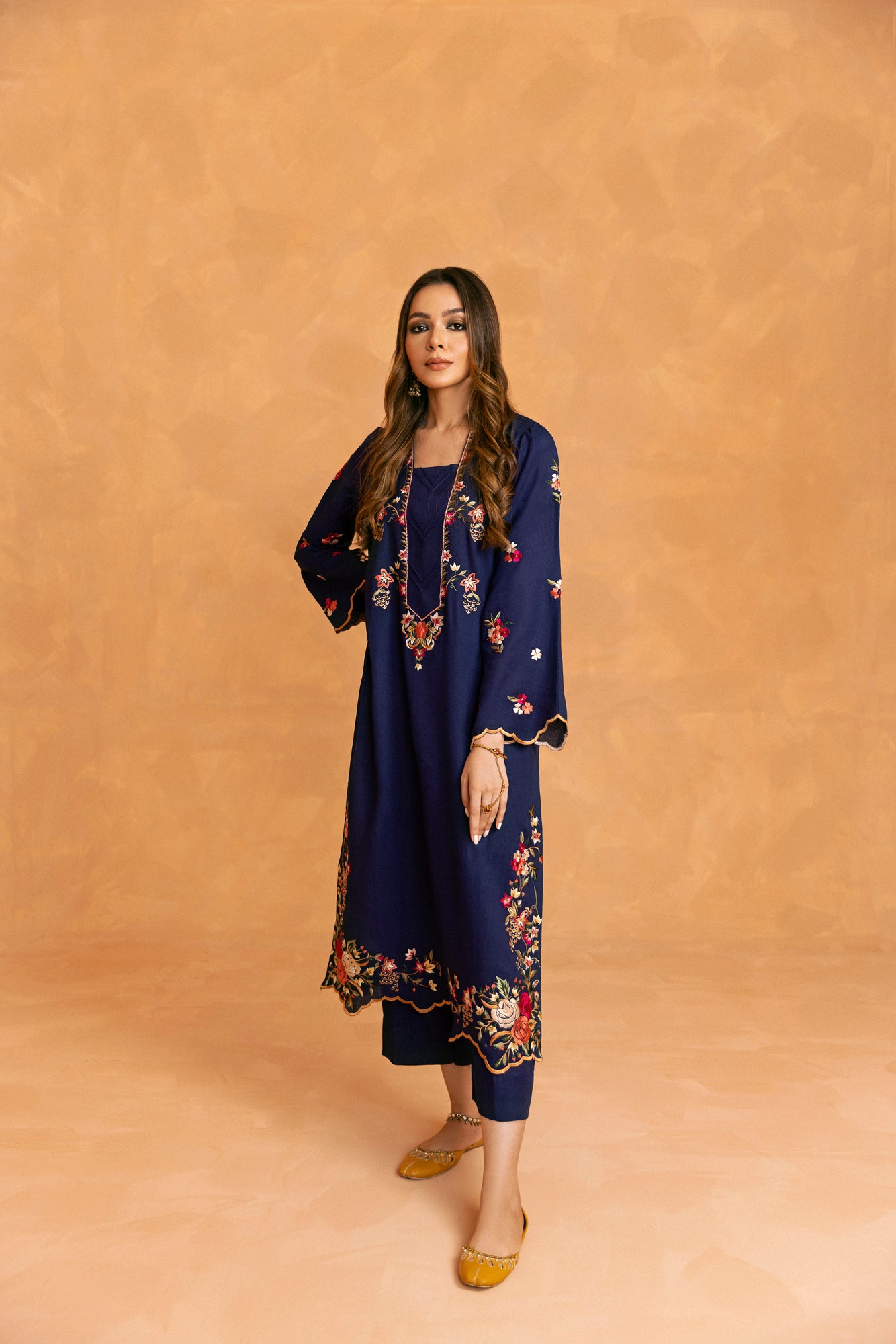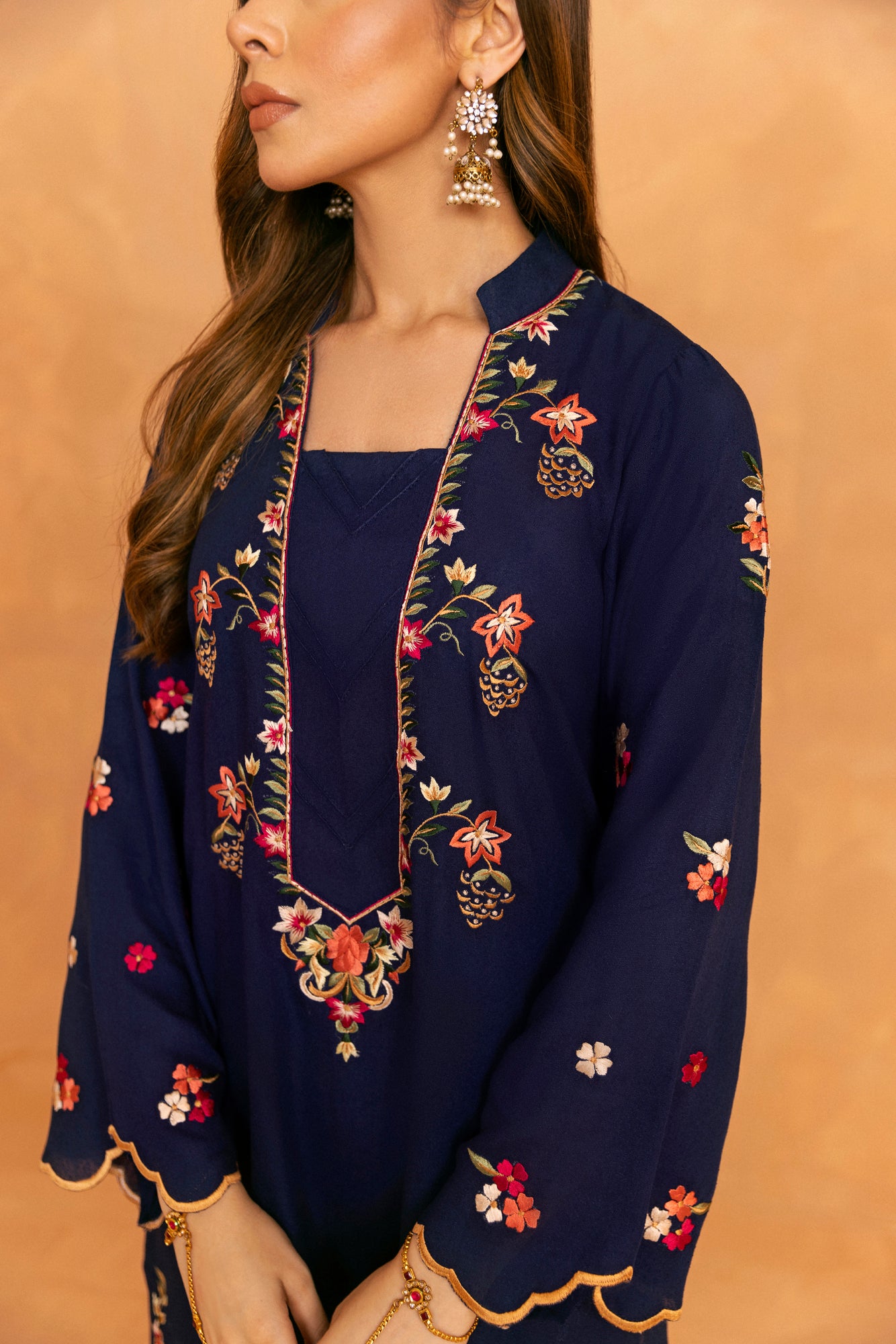 On a pure karandi base this two piece set has an embroidered shirt with floral motifs and scallops on hem and sleeves paired with slacks