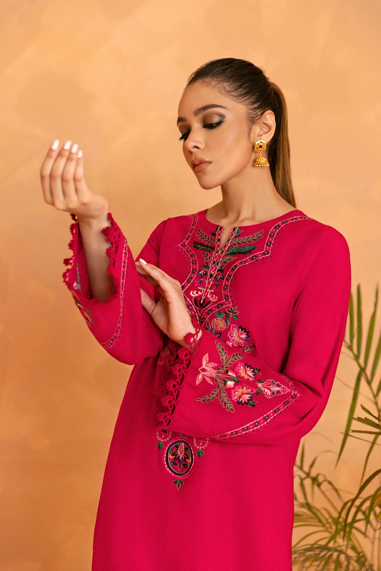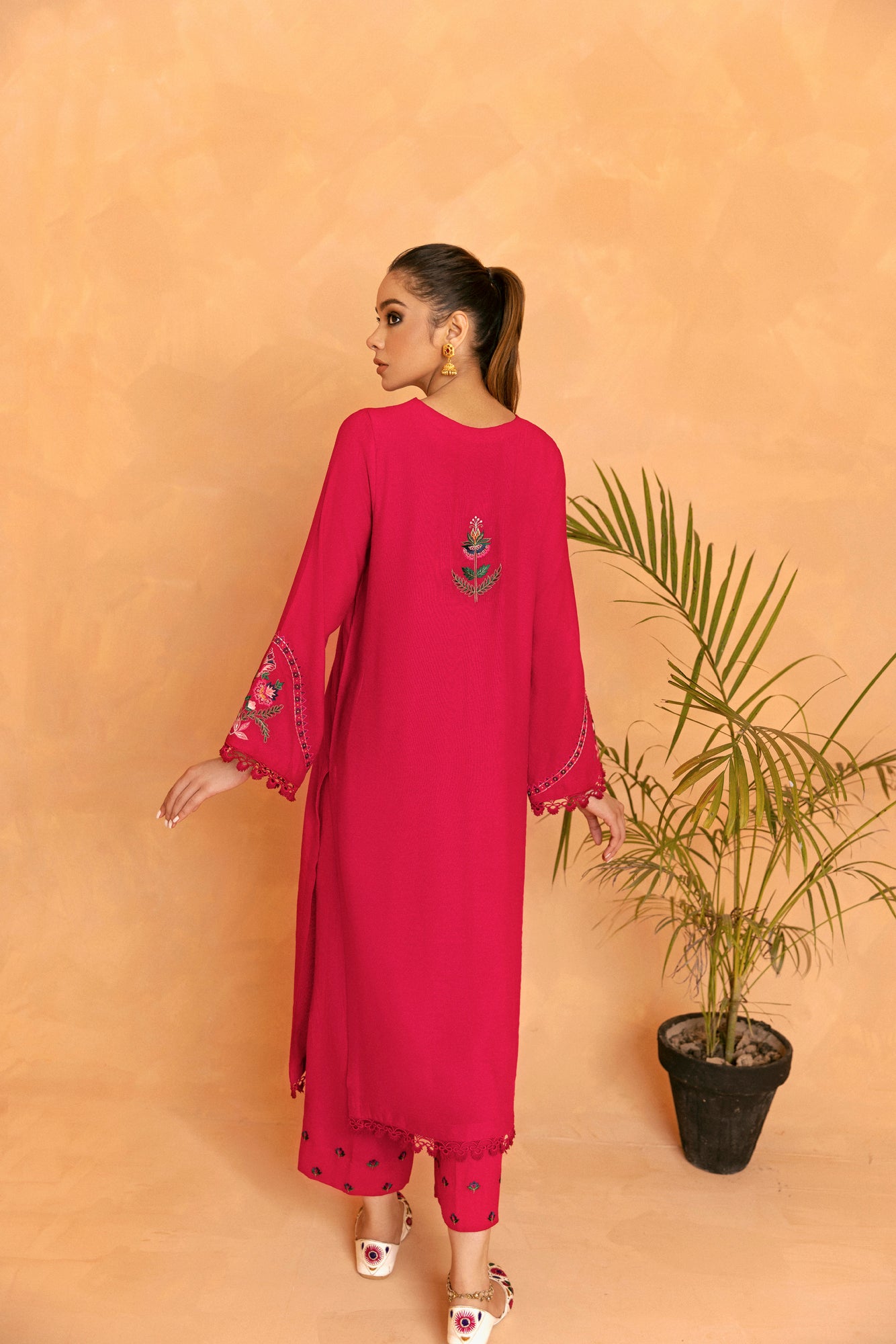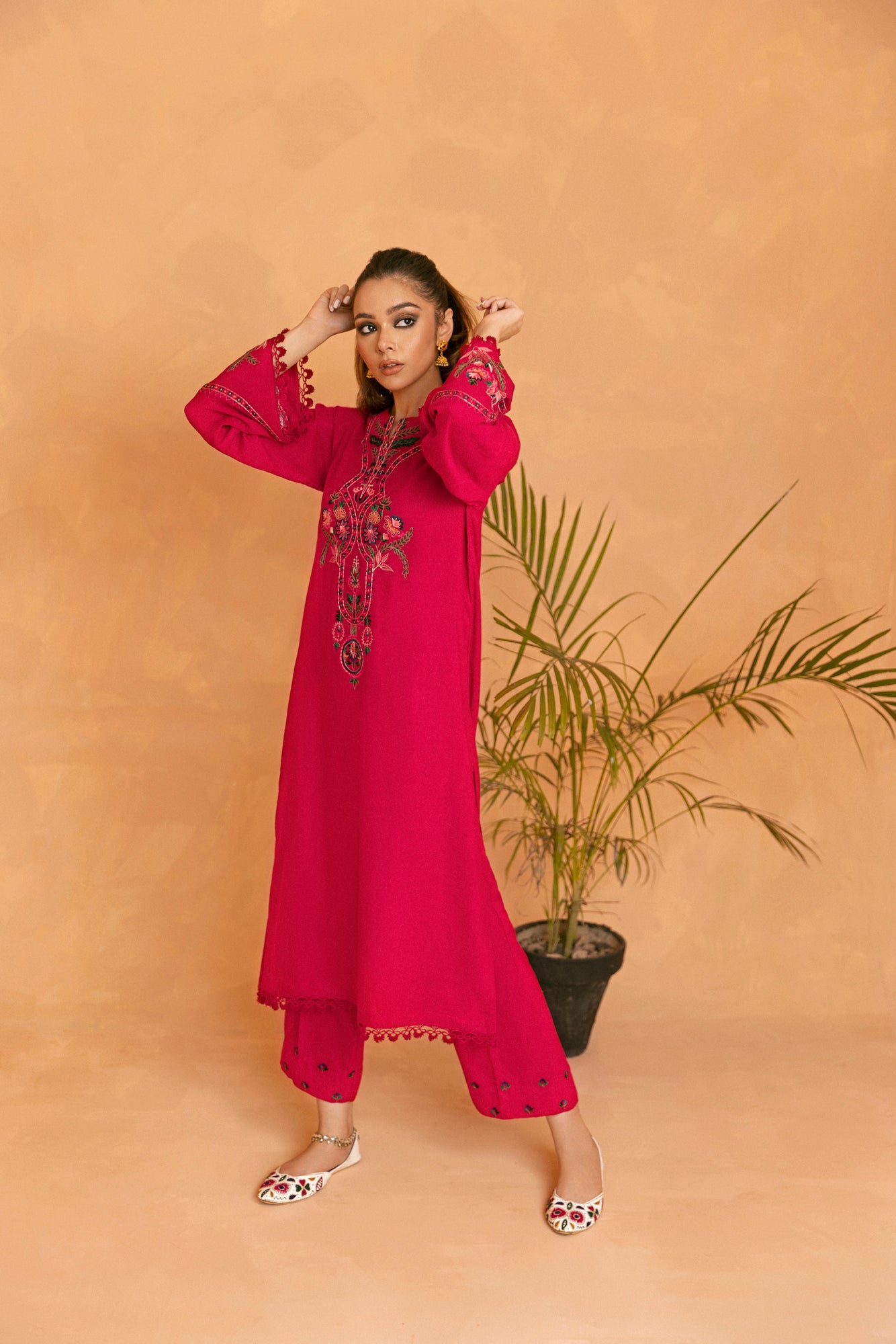 On a pure karandi base this shirt has an embroidered neckline and sleeves finished with lace details all over, paired with embroidered pants