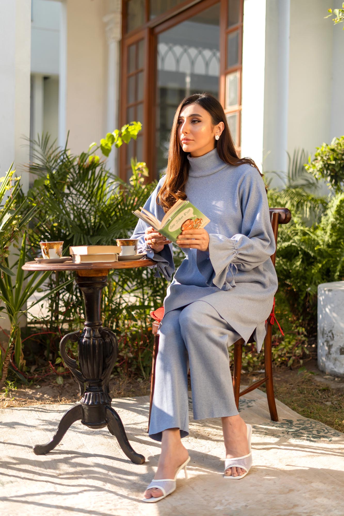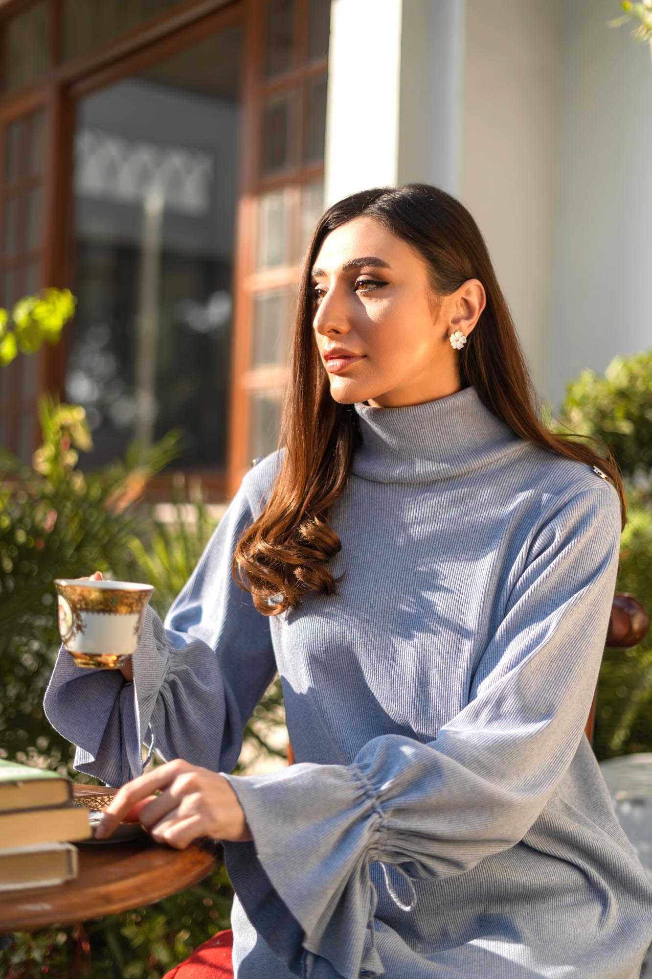 Two piece knitwear set with a hi neck having buttons on shoulders having gathers on sleeves with drawstring detail, paired with straight pants