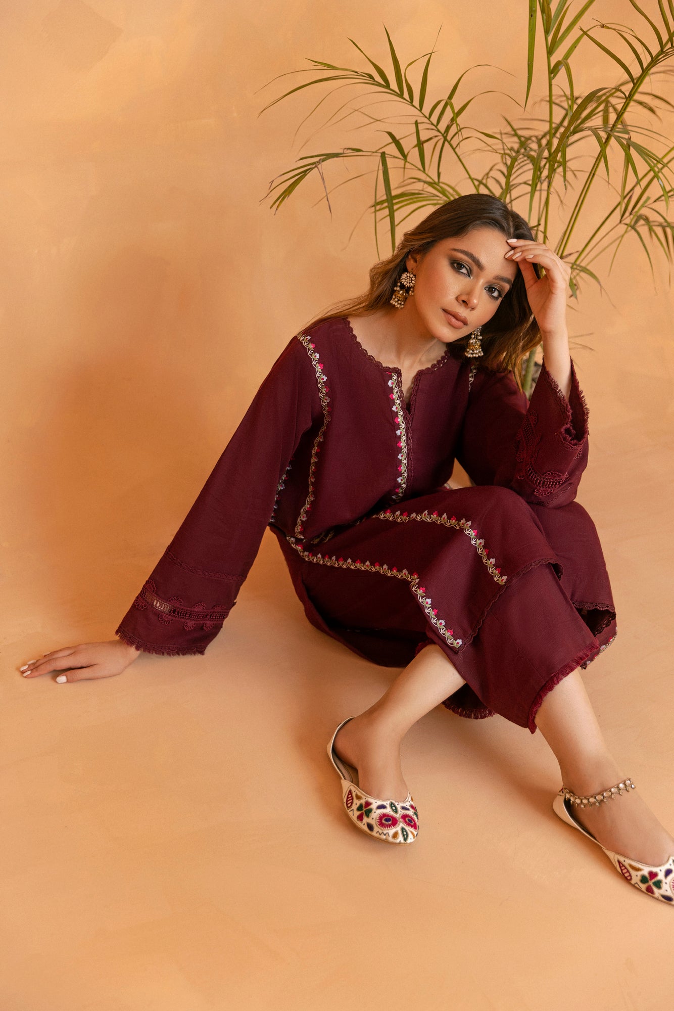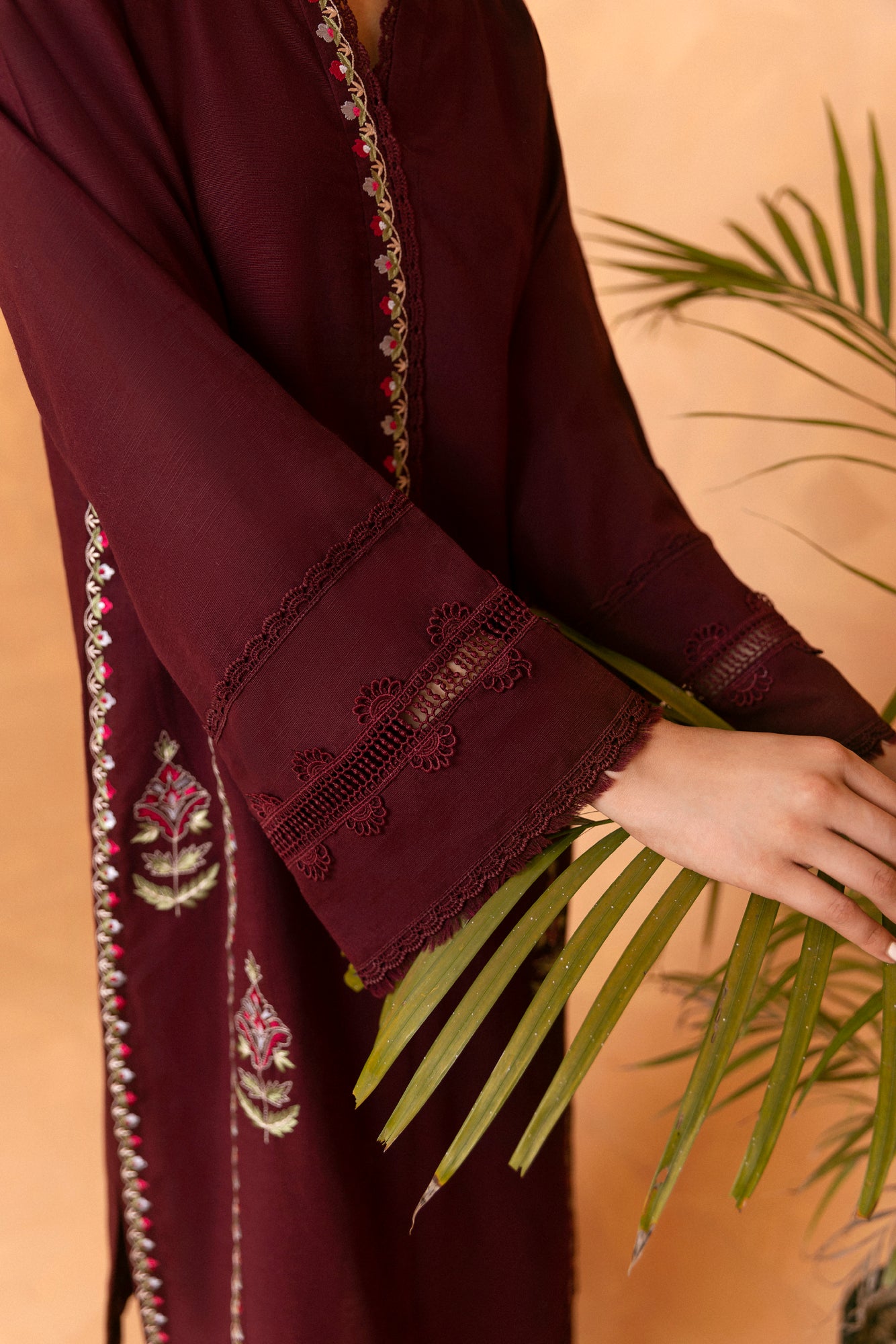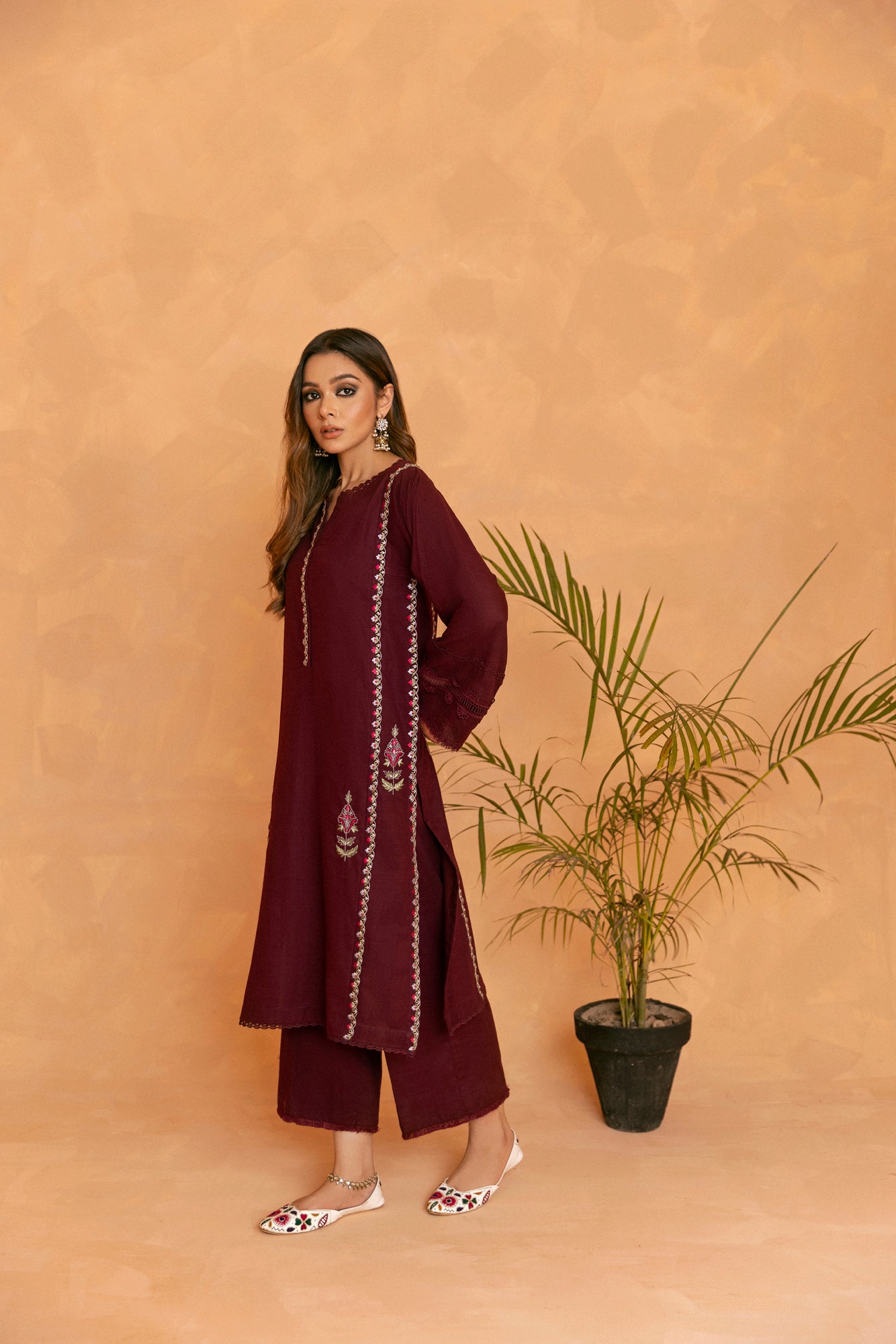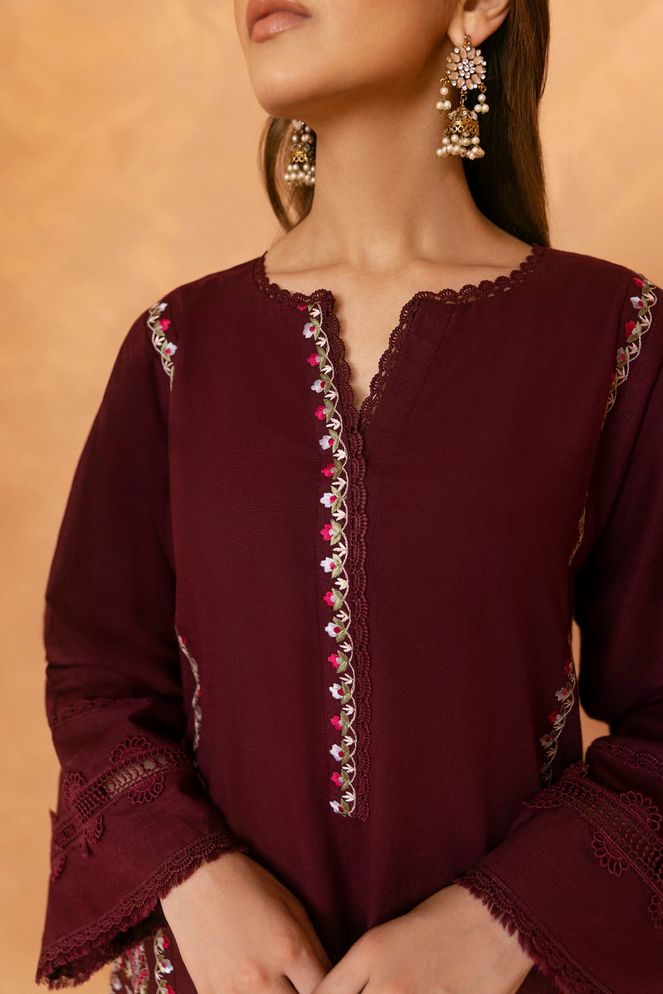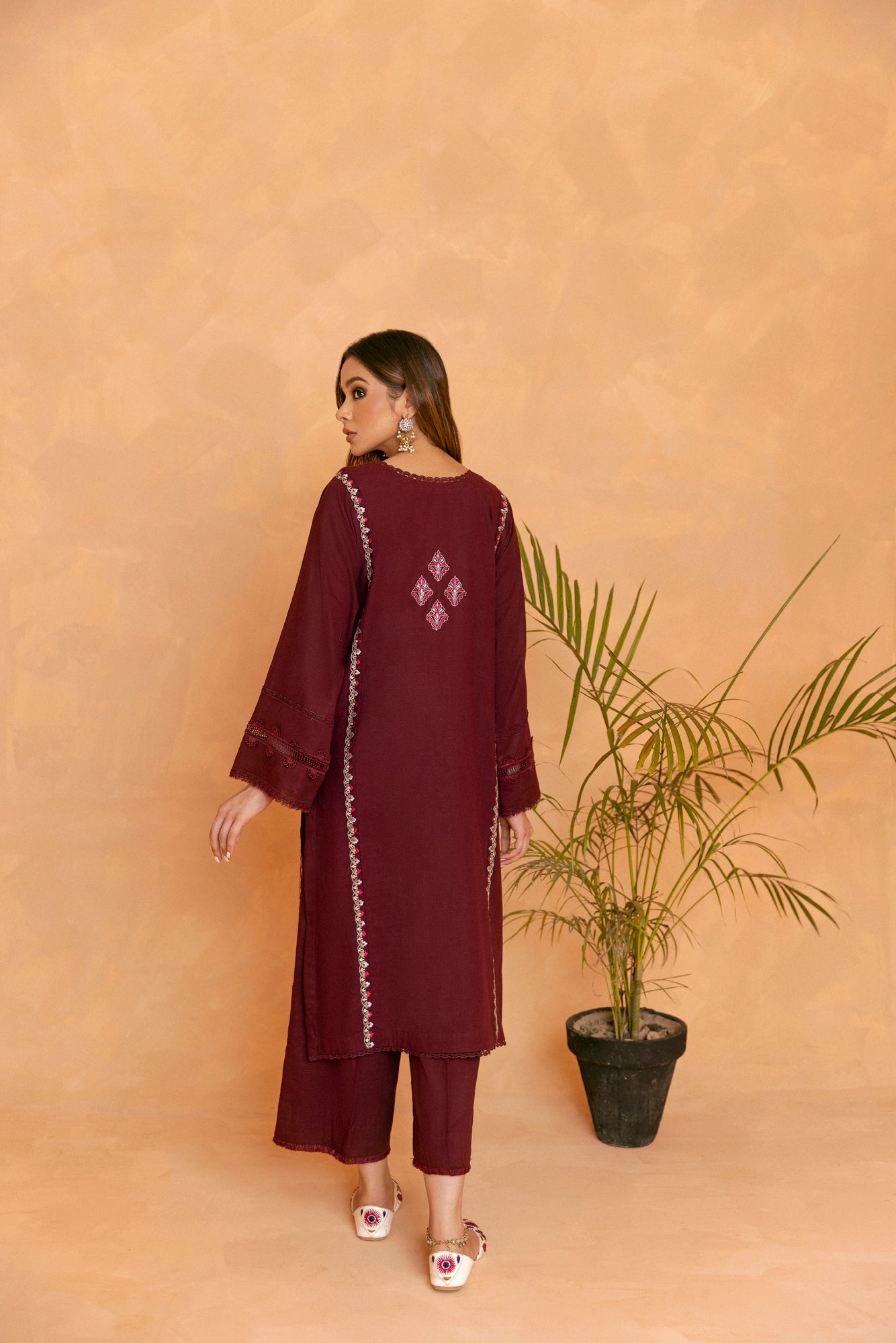 This two piece set is on a slub khaddar base having embroidered panels and motifs on both front and back, having lace details all over, paired with straight pants